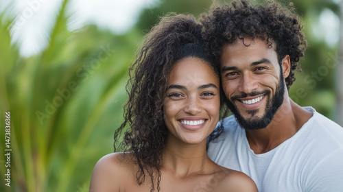couple, smiling, happiness, greenery, joy, togetherness, love, nature, portrait, young, lifestyle, friendship, affection, beauty, summer, casual attire, fun, human relationships, connection, cheerful, vibrant, tropical, carefree, romance, candid, playful, diversity, warmth, harmony