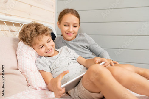 Happy cute little boy and his happy sister in homewear watching online cartoons