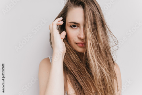 Happy dark-eyed girl posing in morning on light background. Studio shot of enchanting caucasian female model touching her dark hair.
