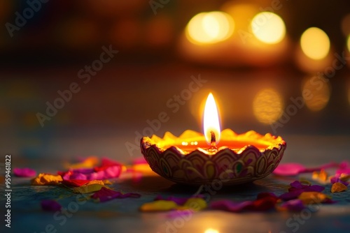 Happy Diwali - Colorful Diya lamp on floor, copy-space with generative ai
