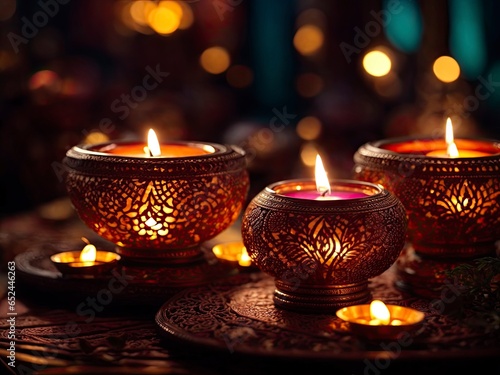 Happy Diwali Festival Diya Lamps with Rangoli Beautiful Clay Diya Lamps Greeting Diwali celebration Poster Invitation Banner Night Lamps Latterns hand carved Diya Lamp Illustration Background wall
