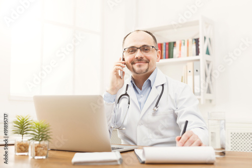 clinic, coat, doctor, health, health care, health care, hospital, man, medicine, office, patient, stethoscope, happy, laptop, male, paediatrician, physician, white, work, desk, laboratory, phone, adult, attractive, beard, bottle, call, caucasian, computer, cosy, diploma, photogenic, hispanic, home, indoor, dietitian, practice, prescription, private, shelf, smartphone, talking, phone, workplace, workspace, smiling, technology, online