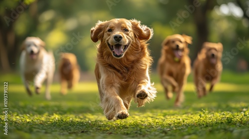 Happy dogs running in the park on national dog day outdoor fun nature vibrant atmosphere joyful moment