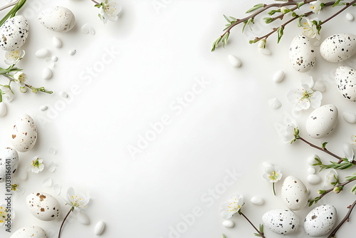 Happy Easter background with white flowers and eggs on the right side, flat lay, top view, copy space concept.