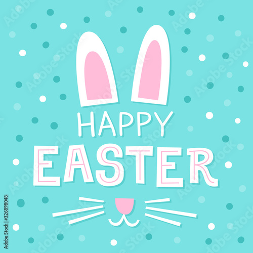 Happy Easter greeting card. Rabbit ears and inscription on the turquoise background with confetti.