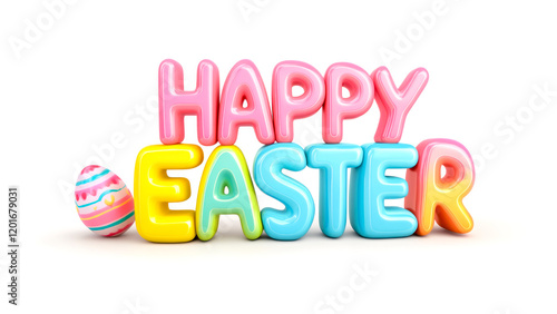Happy Easter holiday card with Happy Easter text in 3D letters, accompanied by colorful decorated eggs on white background. Concept of festive cheer, spring celebration and congratulation
