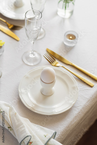 Happy Easter! Spring elegant table setting with white plates, egg cups, gold cutlery and vases with yellow flowers on a white tablecloth