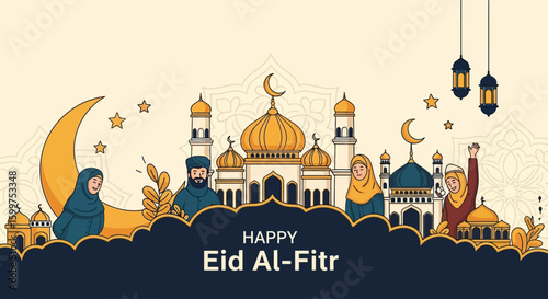 eid, muslim, islam, celebration, festival, joyful, happy, mosque, masjid, crescent moon, star, lantern, ramadan, greeting card, banner, illustration, vector, graphic, artwork, religious, culture, community, spiritual, man, woman, blue, gold, peace