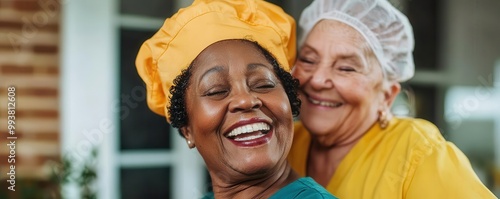 Happy elderly Black woman dancing with a caregiver during a social event at the nursing home nursing home party, joyful senior