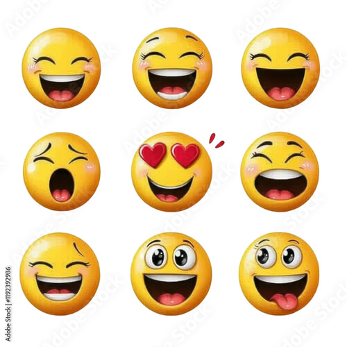 Happy emojis expressing various emotions like joy, love, and excitement. These symbols convey feelings through bright, cheerful faces, perfect for digital communication