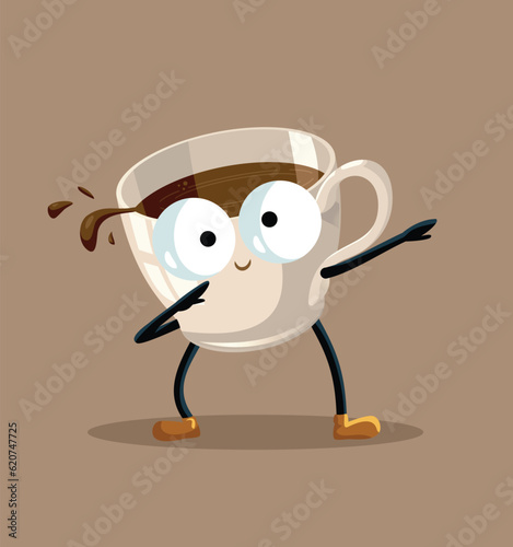 Happy Energetic Coffee Cup Vector Character Dancing and Dabbing. Cheerful caffeine beverage feeling in a good mood spreading good vibes