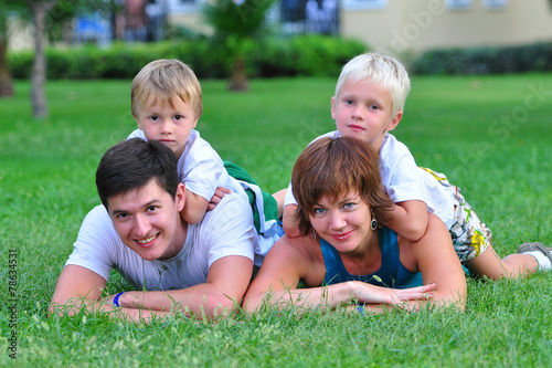 family, father, mother, husband, wife, eltern, group, married, childhood, children, baby, year, children, boy, son, blond, brunette, woman, man, male, female, adult, people, couple, outdoors, nature, park, healthy, shirt, short, summer, joy, sunlight, vacation, smile, fun, enjoyment, cheerful, happiness, together, portrait, rest, relaxation, holiday, grass, green, day, lawn, picnic