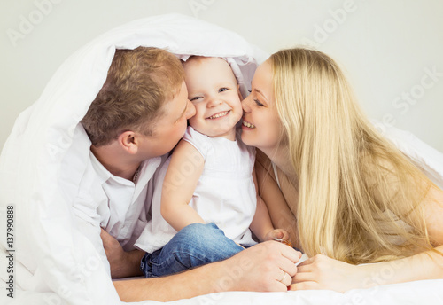 family, bed, home, children, girl, daughter, woman, man, mother, father, children, eltern, parenting, happy, kiss, happiness, positive, relax, rest, cheerful, joy, joyful, fun, love, affection, three, people, lifestyle, white, linen, indoor, insides, caucasian, casual attire, person, portrait, tender, tenderness, together, togetherness, smile, laugh, wife, husband, relation, relative, blanket, baby, harmony
