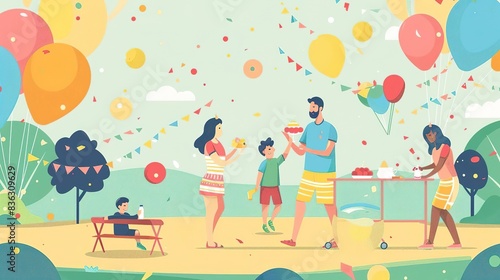 happy, family, celebrate, birthday, party, balloon, confetti, picnic, joy, cloud, leaves, son, group, lunch, sky, children, meal, bond, flat, cheese, green, father, fruit, laugh, wine, time, smile, mother, camp