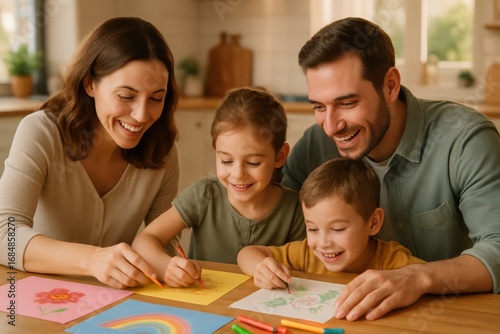 family, children, drawing, colouring, creativity, art, fun, activity, together, home, lifestyle, bonding, childhood, parenting, casual attire, cheerful, happy, joyful, leisure, teamwork, playtime, entertainment, playful, artwork, crayons, colourful, imagination, education, inspiration, smiling, cosy, love, weekend, indoor, togetherness, connection, creation, friendship, happiness
