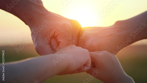 Happy family enjoys successful life at back sunset. Members give fists walking on evening meadow. Parents have business and can ensure children life closeup