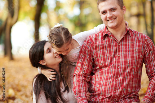 Happy family is in autumn city park. Children and parents. They posing, smiling, playing and having fun. Bright yellow trees.