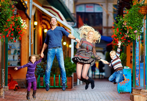 happy, family, jump, fun, play, eltern, children, children, daughter, group, boy, girl, son, mother, father, city, street, rain, playful, colourful, day, happiness, fashion, outside, season, spring, autumn, together, woman, man, 4, person, people, young, youth, beautiful, smile, emotion, relation, expression, portrait, active, activity, sport, love, delight, joy, enjoy, game