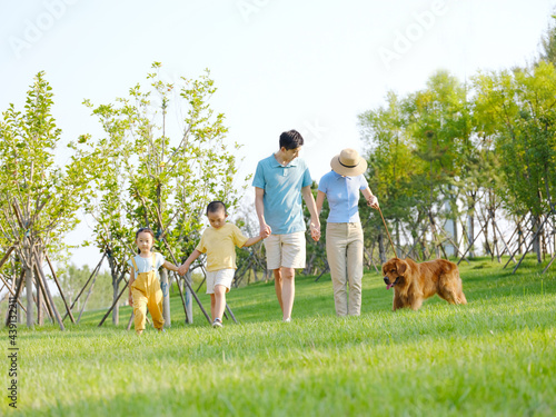 chinese, adult, young people, man, woman, four people, son, daughter, children, boy, girl, father, mother, china, beijing, park, suburb, image, photo, lifestyle, childhood, nature, scenery, environment, tour tourism, vacation, walking, hand in hand, holding, tree, grass, casual clothes, hat, pet, dog, animal, retriever, golden retriever, day