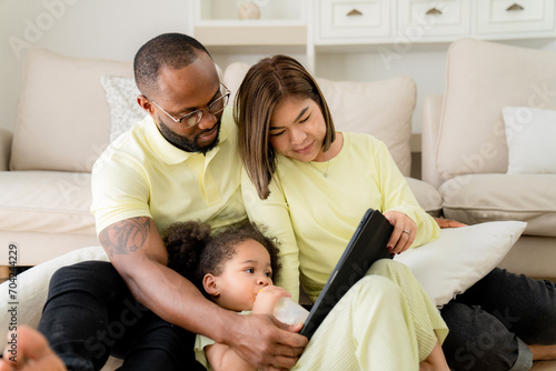 Happy Family Of Three With Little Daughter Having Fun Together At Home, Playing With Their Child In the Living Room, Happy black family Weekend.