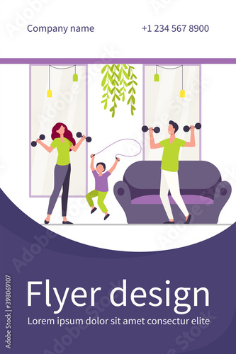 Happy family training together flat vector illustration. Cartoon active people doing strength exercise in living room. Wellness and workout at home concept