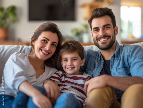 Happy family with child sitting on sofa, young parents embracing son relaxing on couch together
