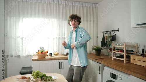 Happy father move to music while cooking food and prepare lunch at modern kitchen. Active dad dancing to song while making healthy food or salad surrounded with vegetable and kitchenware. Pedagogy.