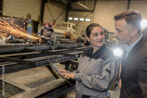 metallurgy, industry, laptop, factory, colleague, boss, communication, co-worker, discussion, engineer, female, male, man, manager, pointing, sharing, showing, smile, sparkle, tablet, talking, teamwork, technology, welder, woman