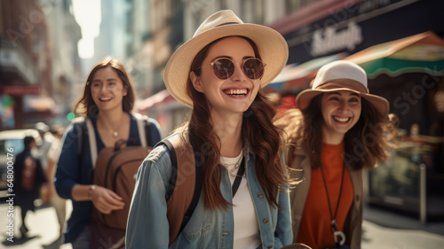 happy female friends travelers with bags crossing street together outdoor sunny day in china town.