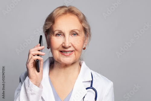 Happy female physician or surgeon gives prescription via mobile phone, closeup portrait
