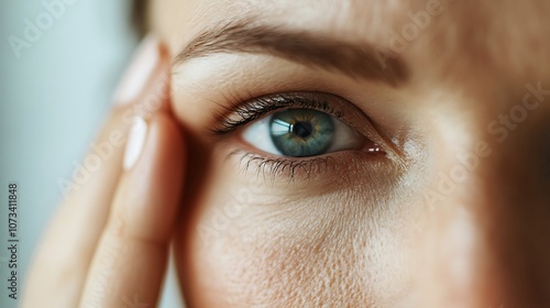 Happy female using moisturizing eye cream. Close-up of woman with dots of eye cream.