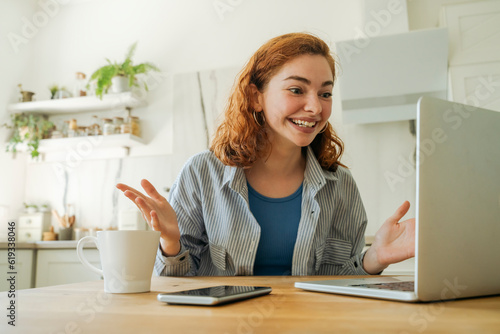 happy, freelancer, talking, video, laptop, home, smartphone, happiness, smiling, copy space, technology, 1, people, computer, communication, adult, online, woman, interior, kitchen, sitting, beautiful, occupation, job, connection, wireless, mobile, phone, hot drink, cup, refreshment, using, cyberspace, working, redheaded, young, table, caucasian, lifestyle, gesticulate, gesture, drink, call, chat, connectivity, female
