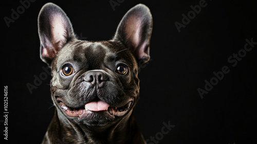 french bulldog, dog, pet, animal, portrait, happy, studio, black background, cheerful, puppy, canino, cute, expression, personality, breed, light, shadow, playful, small dog, black dog, smiling, friendly, closeup, sharpened, adorable, trendy, stylish, modern, joyful, attention, curiosity, dark background, companion