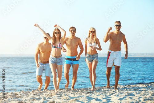 Happy friends running at the beach, outdoors