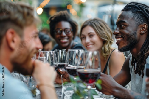 Happy friends sitting at restaurant tables drinking red wine - multi-racial young people enjoying a rooftop dinner party together - boys and girls taking a lunch break outside the concept of food and