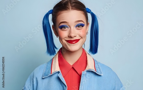 portrait, girl, woman, happy, smiling, blue, hair, red, lipstick, denim, jacket, make-up, eyeshadow, red lips, fashion, style, model, beauty, youth, positive, cheerful, bright, vibrant, colourful, trendy, cool, casual attire, clothing, accessory, expression, face, look, attitude, pose, studio, background, light blue, photo, image, graphic, person