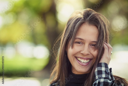 Happy girl, portrait and weekend with freedom in nature for holiday, travel or carefree attitude at park. Young, female person or smile in joy or relax for hairstyle, fresh air or outdoor adventure