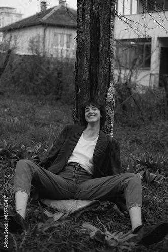 apparel, art, artsy, clothing, denim, emotion, face, french, furniture, ground, house, jean, model, outdoors, pant, plant, shoe, sitting, tree trunk, vegetation