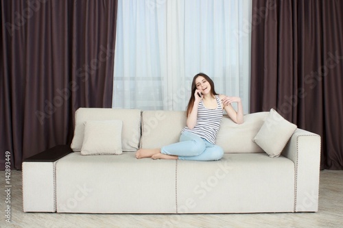 phone, people, girl, house, couch, home, beautiful, casual attire, female, interior, life, lifestyle, living, portrait, relax, resting, room, sitting, speaking, technology, white, working, young, mobile, teenage, fashion, tied-up, happy, smiling, woman, adult, asking, attractive, background, brunette, business, calling, candid, mobile phone, mobile phone, cellular, chatting, cheerful, consulting, conversation, client, device, domestic, employed
