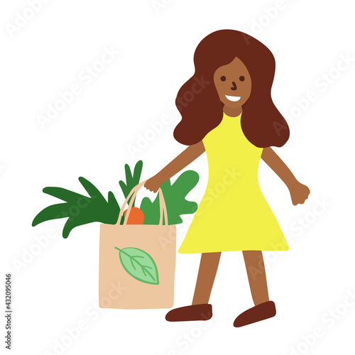 happy, girl, bag, full, vegetable, healthy, vegetarian, food, concept, lunch, female, person, woman, ethnicity, diet, human, cartoon, eating, meal, hold, dieting, health, nourishment, adult, young, african, american, kitchen, organic, black, fresh, shopping, smiling, natural, raw, slimming, shopper, flat, wellness, design, cooking, consumer, yellow, product, dress, cookery, salad, vitamin, raster