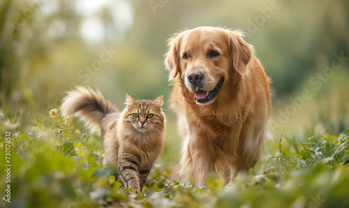 Happy golden retriever dog walking with a cute cat on a green large size field with natural sunlight .