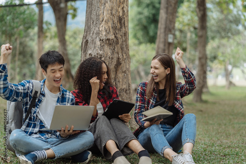 Happy group of college students use laptop feel excited overjoyed triumph with good news over smartphone or Tablet.