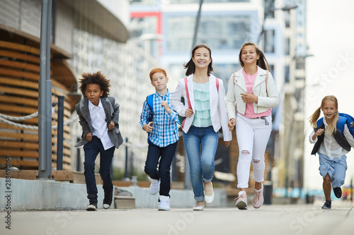 Happy group of school children running outdoors together they rushing to school