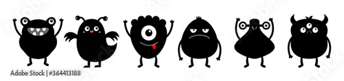Happy Halloween. Monster black silhouette icon set line. Eyes, horns, hands up, tongue. Six cute cartoon kawaii sad character. Funny baby collection. Isolated. White background. Flat design.