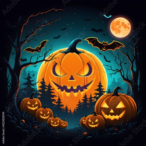 halloween, pumpkin, night, bat, autumn, moon, vector, horror, holiday, illustration, dark, october, skittish, scarey, tree, design, black, celebration, silhouette, evil, orange, fear, card, cartoon, sorcerer