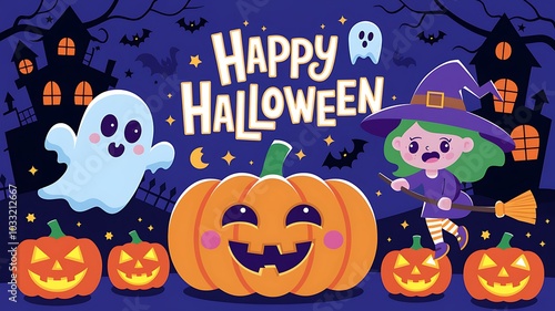 Happy Halloween with a Witch, Ghosts, and Jack-o-Lanterns