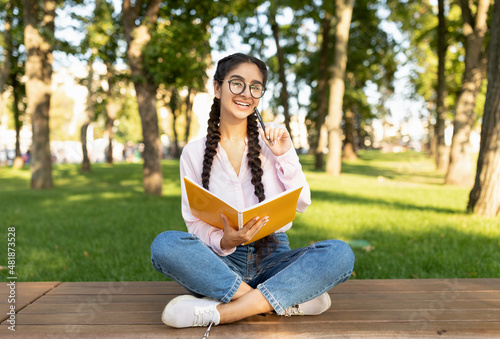 Happy indian female student writing in notebook outdoors, studying while sitting in campus park on bench