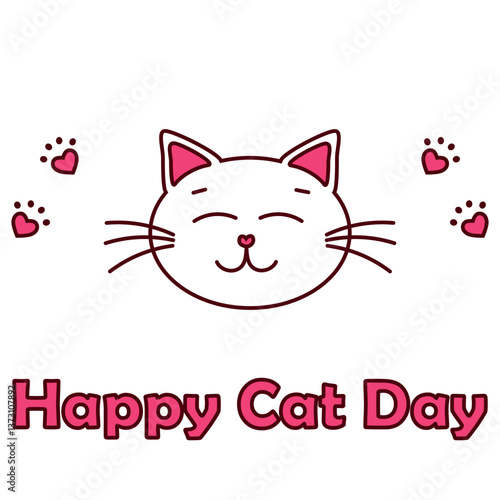 Happy International Cat Day vector illustration with cute cat and paws in flat line style in pink brown colour on white background. Vector illustration happy cat day