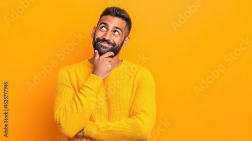 happy, joyful, smiling, young, indian, man, up, thinking, dreaming, inspired, proud, standing, isolated, yellow background, portrait, confident, optimistic, successful, cheerful, positive, hopeful, contemplative, ambitious, motivated, elated, content, creative, visionary, energetic, enthusiastic, determined, focused, professional, casual attire, smart, attractive, exuberant, thoughtful, charismatic, happiness, achievement, aspiration, inspiration