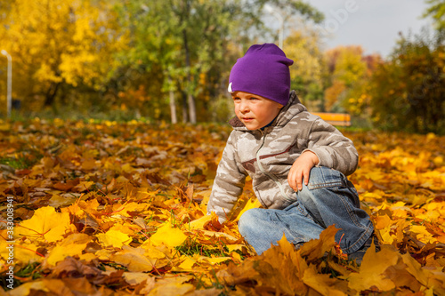 Happy kid sitting on carpet of fallen leaves in autumn park